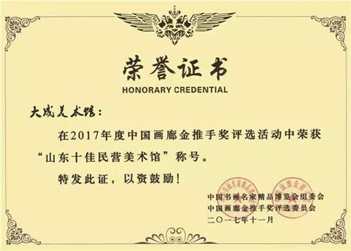 近日,在第六屆中國(guó)書畫市場(chǎng)健康發(fā)展論壇暨2017年度中國(guó)畫廊金推手獎(jiǎng)?lì)C獎(jiǎng)盛典上,集團(tuán)旗下的大成美術(shù)館(濟(jì)南城建集團(tuán)直屬機(jī)構(gòu))應(yīng)邀參加論壇并榮獲2017年度“山東十佳民營(yíng)美術(shù)館”稱號(hào)。