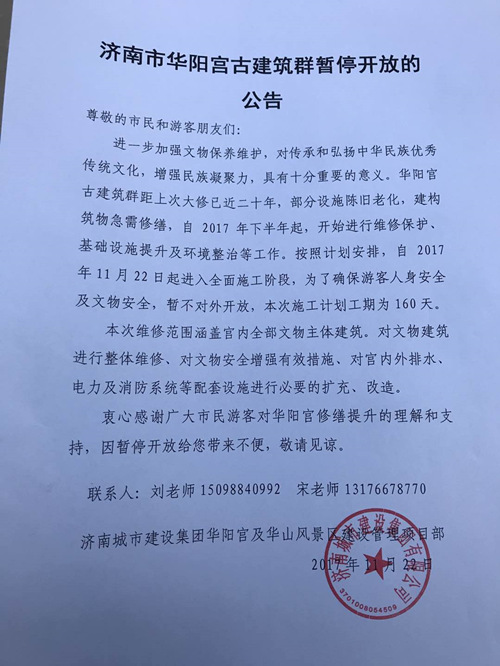 11月22日,因華陽宮古建筑群部分設(shè)施陳舊老化,建構(gòu)筑物急需修繕,即日起進入全面施工修復(fù)階段。濟南城市建設(shè)集團華陽宮及華山風景區(qū)建設(shè)管理項目部發(fā)布濟南市華陽宮古建筑群暫停開放的公告。