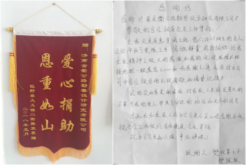 5月24日,菏澤市巨野縣大義鎮(zhèn)二街樊雙喜委托家人專程來到濟(jì)南金衢公路勘察設(shè)計(jì)研究有限公司,將一面寫有“愛心捐助 恩重如山”的錦旗和一封感謝信送到公司工作人員手中,借此表達(dá)對(duì)濟(jì)南金衢公司全體員工對(duì)樊雙喜一家及時(shí)伸出援助之手、慷慨解囊渡難關(guān)的感激之情。