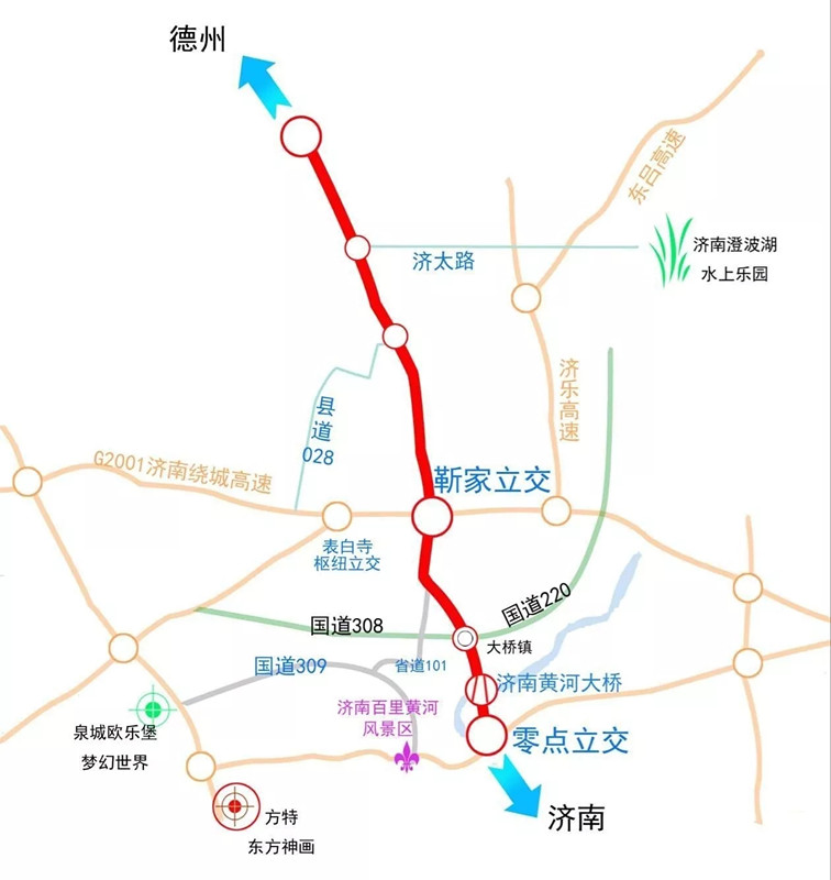 G104京福線濟(jì)南德州界至大橋鎮(zhèn)段改建工程全長29.69公里,起于德州市臨邑縣夏口大橋南,途經(jīng)濟(jì)陽縣太平鎮(zhèn)、孫耿鎮(zhèn),止于天橋區(qū)大橋鎮(zhèn)G220、G308交叉口,一級公路標(biāo)準(zhǔn),設(shè)計時速80公里/小時。