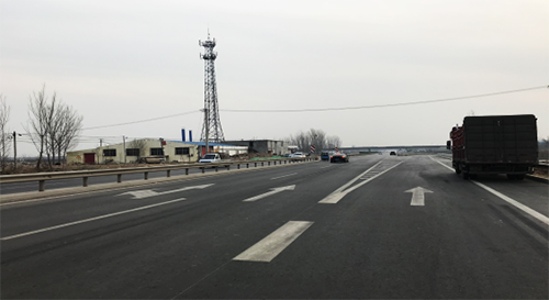 為提示駕駛員按車道行駛,避免駕駛員疲勞駕駛,該項(xiàng)目除設(shè)置縱向振動標(biāo)線外,橫向還設(shè)置了更加醒目的紅色振動標(biāo)線,既提高了車輛行駛的安全性,又提升了標(biāo)線視覺上的警示功能,給單調(diào)的路面增添了一份色彩。