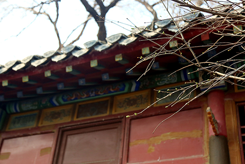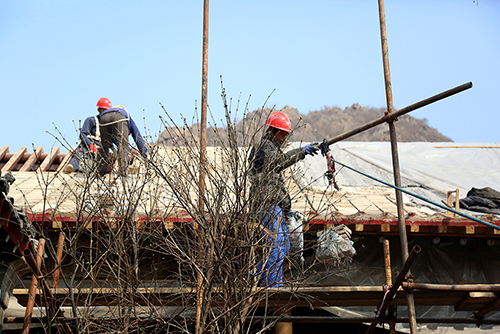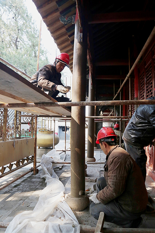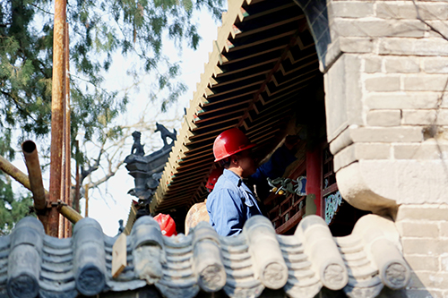 在現(xiàn)場可以看到,冬季過后,“修煉內(nèi)功”的綜合管線敷設(shè)、地形塑造、受損的磚作石作木作基底清理工作已基本完成,“濕作業(yè)”階段已經(jīng)全面展開。目前正在進(jìn)行中的主要工作為建筑屋面的修繕,建筑墻體的修補(bǔ),路面、石階、古磚的清理修復(fù),建筑木構(gòu)件的砍活與重新上漆,木構(gòu)件表面彩繪的清理除塵等工作。