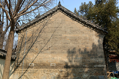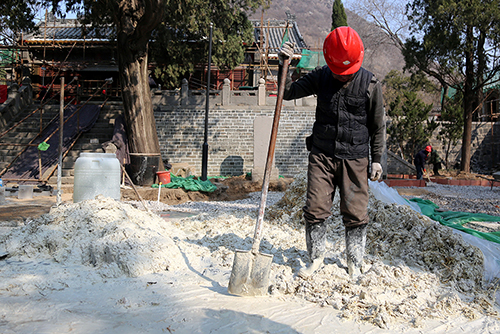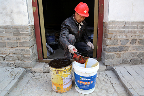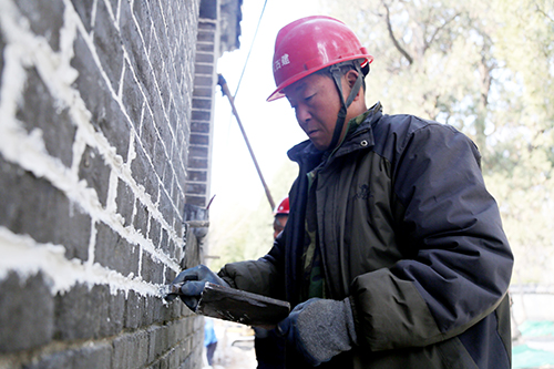 古法之三,磚藥與青磚白灰。在華陽宮內(nèi)的古建墻壁上,很多磚塊因為年代久遠(yuǎn)及腐蝕原因,有不同程度的破損,對墻面破損較輕微的磚塊,以修復(fù)方式,不作替換,具體用水泥、松煙與磚沫制成與墻面顏色一致的磚藥,用磨平與壓死的方式修補(bǔ),還原磚塊原樣。在墻面修補(bǔ)方面,采用青磚白條灰勾縫進(jìn)行處理,恢復(fù)古建筑外貌。據(jù)了解,一位技術(shù)工人一天約能完成高度約50公分的青磚白條灰勾縫修補(bǔ)工作。