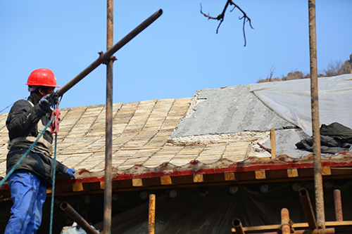 古法之一,苫背。苫(shàn)背,指蓋房子時在草席等上面抹上灰和泥土做成房頂?shù)蛯樱梢杂行Х乐刮菝媛┧?。苫背是華陽宮修繕的重點(diǎn)工作之一,先上一層厚度約2公分的護(hù)板灰,再上一層厚度約6公分的麥秸灰,最后上一層厚度約2公分白灰與麻道灰的混合灰。苫背工作完成后,可以進(jìn)行下一步屋面瓦件鋪設(shè)。在苫背過程中,只拆除更換已損壞的灰層,仍然保留可以繼續(xù)使用的古灰層。
