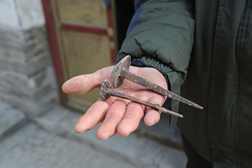 古法之六,蓋頭釘。華陽宮古建筑中用來固定檁條、望板等構(gòu)件的蓋頭釘,保存完好的兩三百年都未生銹,此次修復(fù)過程中替換的蓋頭釘仍采用古法鍛造,替換部分腐蝕無法使用的舊釘,而這種技藝的蓋頭釘,目前國內(nèi)基本只有曲阜的幾家作坊還在生產(chǎn)制作。