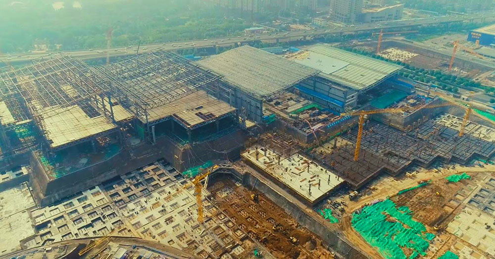 目前,展館區(qū)域主體鋼結(jié)構(gòu)進入收尾階段,其中4號館、5號館已完成主體結(jié)構(gòu)驗收,已全面轉(zhuǎn)入金屬屋面、幕墻外圍護體系及室內(nèi)裝飾、安裝施工階段;1號館、2號館及3號館主體鋼結(jié)構(gòu)施工正處于收尾階段;整個展館區(qū)域計劃6月底主體結(jié)構(gòu)封頂。
