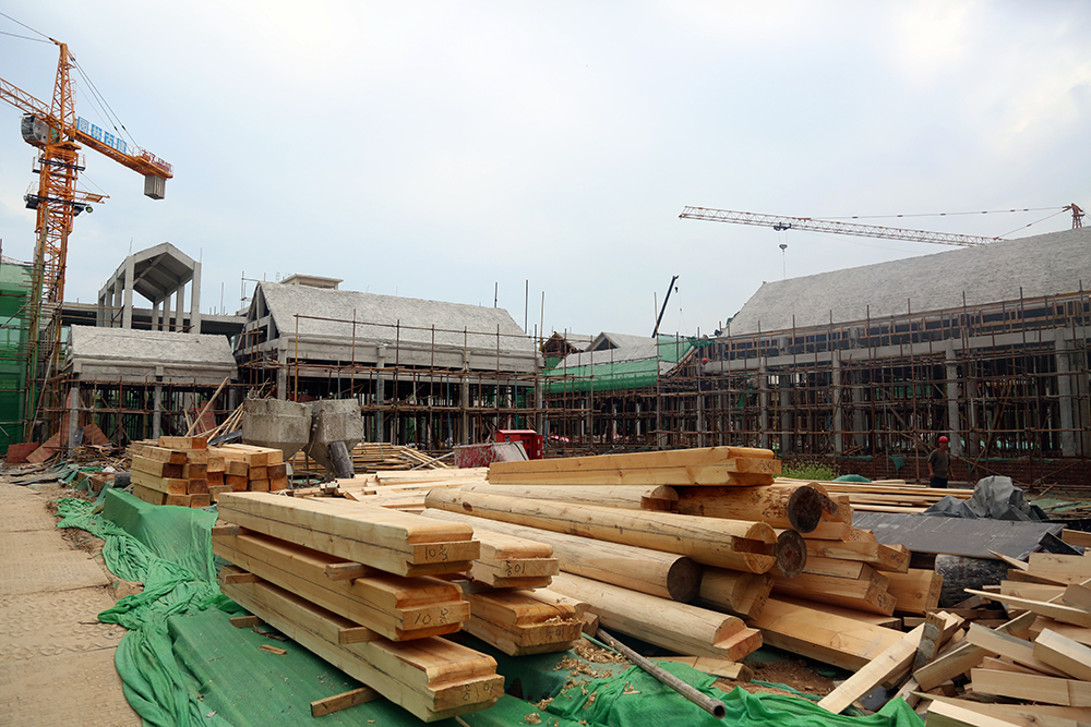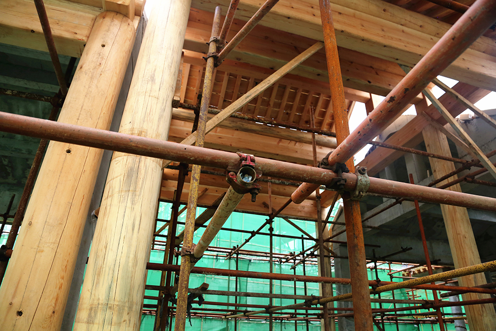 為消防安全考慮,項目建筑的屋頂及大部分構件都摒棄了木質(zhì)結構,統(tǒng)一采用鋼筋混凝土結構。雖然采用了現(xiàn)代材料,但是施工復雜程度卻比原始工藝大的多。“屋頂?shù)臉嫾脤iT定制的模板逐層澆筑,較長的房梁還要逐段拼接,同時又要保證細節(jié)到位,做起來就比較耗時”,現(xiàn)場負責人介紹道。在項目入口處,有一棟小型建筑為全木制結構,據(jù)介紹,這棟建筑僅用三天就建造完成,而如果采用鋼筋混凝土結構,至少需要20天工期。