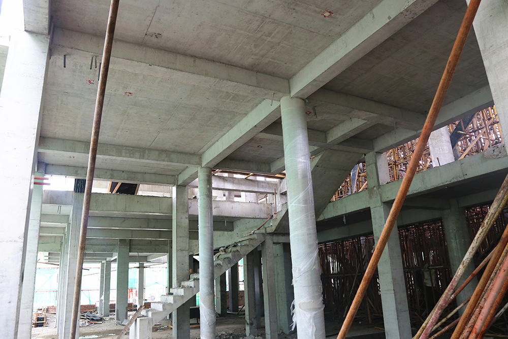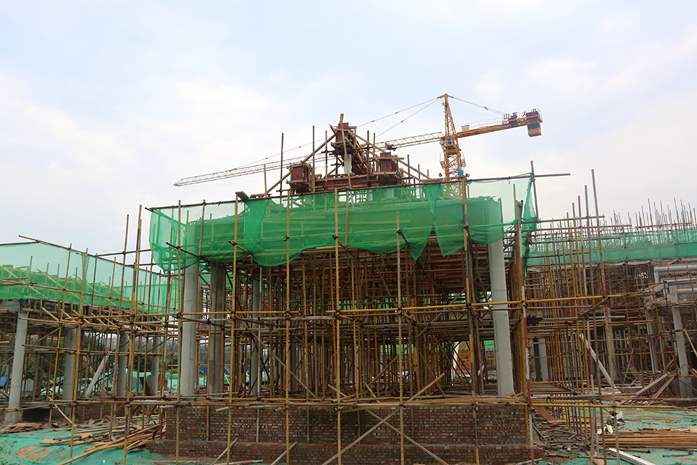 城門樓的工程量最大,項目內(nèi)施工難度最大的是緊靠城門樓的一棟2.5層(局部三層)的中西結合建筑,該建筑內(nèi)部為錯層結構,樓板需要逐層澆筑,同時還有單層挑高8米的高支模(高支模是指支模高度大于或等于5m時的支模作業(yè))作業(yè),施工方案經(jīng)專家反復論證后施行,為保證工期,這棟2.5層的“小建筑”最多80位工人同時施工。同樣,為了整個項目的推進速度,項目高峰作業(yè)期400多位工人同時施工,保證項目按質(zhì)按量推進。
