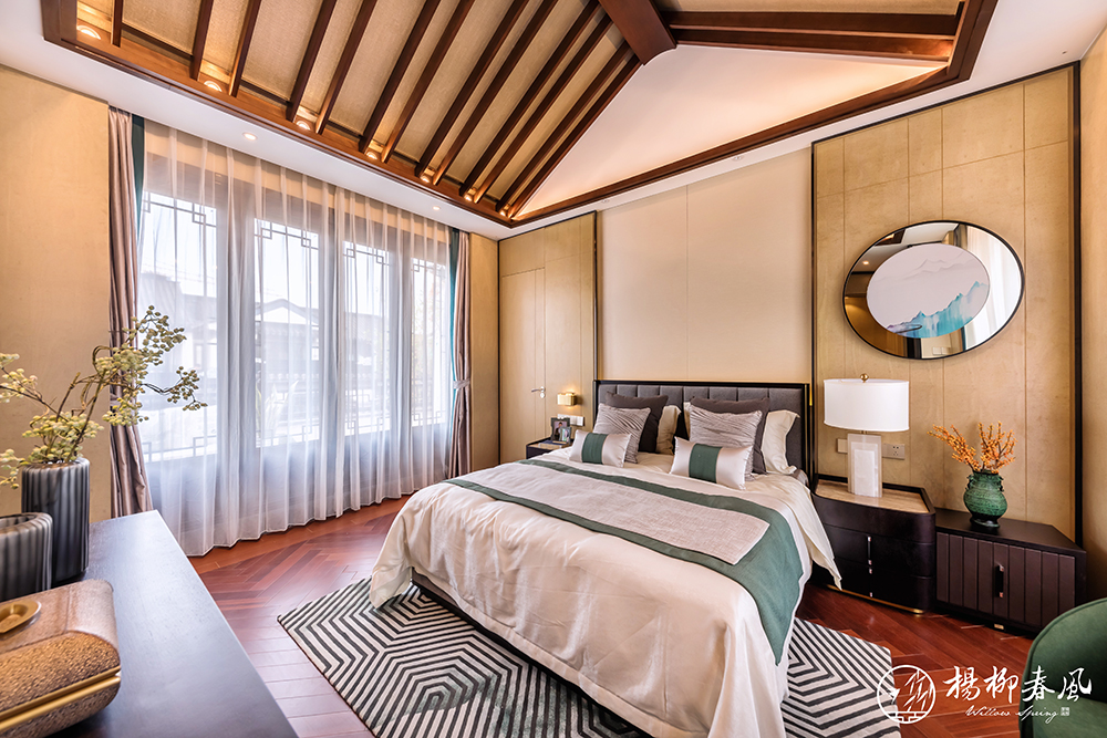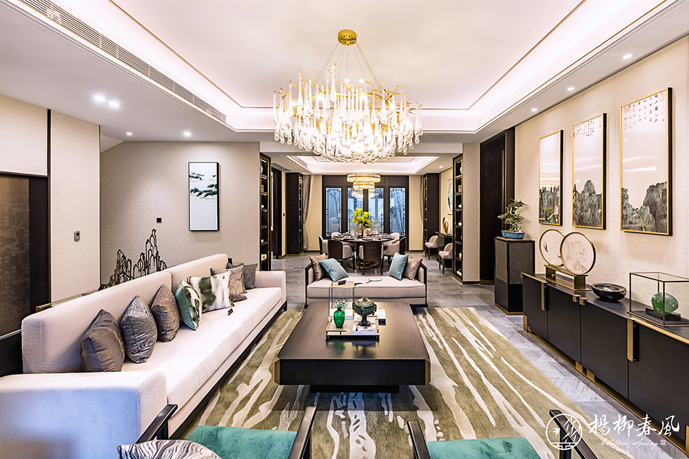 另一套大戶(hù)型樣板房采用新中式風(fēng)格,以儒家思想為依托,通過(guò)大理石、金屬銅、木材的有機(jī)結(jié)合,體現(xiàn)主人的穩(wěn)重、尊貴和優(yōu)雅。約110㎡的大面積庭院,演繹著四季不落幕的錦繡風(fēng)光;挑高約5.7米的地下空間,讓格調(diào)生活隨心定制。整套樣板房抒寫(xiě)著文雅靈動(dòng)的東方氣韻,展現(xiàn)了“中正和雅”的國(guó)風(fēng)意境。