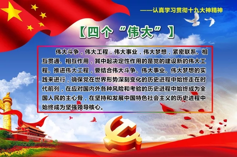黨的十九大修改黨章明確把統(tǒng)攬“四個(gè)偉大”寫(xiě)了進(jìn)來(lái),“四個(gè)偉大”指的是進(jìn)行偉大斗爭(zhēng)、建設(shè)偉大工程、推進(jìn)偉大事業(yè)、實(shí)現(xiàn)偉大夢(mèng)想。