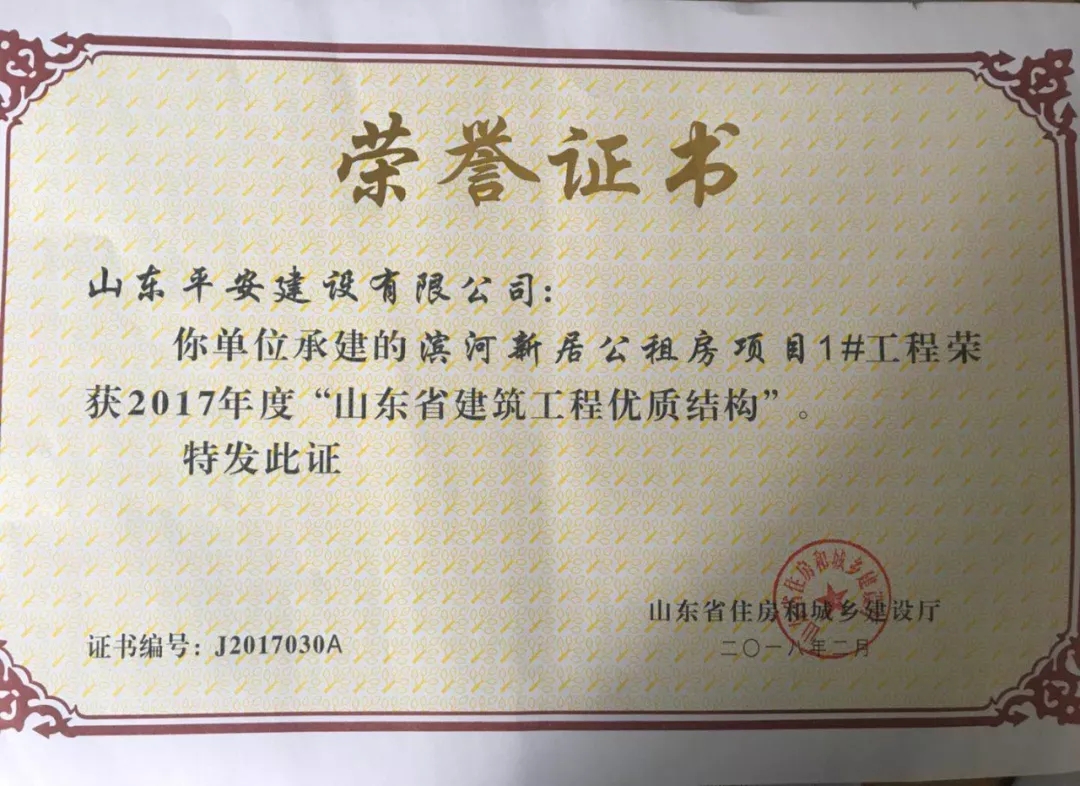 近日,由濟(jì)南城市建設(shè)集團(tuán)負(fù)責(zé)建設(shè)的濱河新居公共租賃住房工程1#樓,在山東省住房和城鄉(xiāng)建設(shè)廳組織的2017年度“山東省建筑工程優(yōu)質(zhì)結(jié)構(gòu)”評審中,憑借過硬的質(zhì)量、完善的管理順利通過專家考評,喜獲“山東省建筑工程優(yōu)質(zhì)結(jié)構(gòu)”獎。