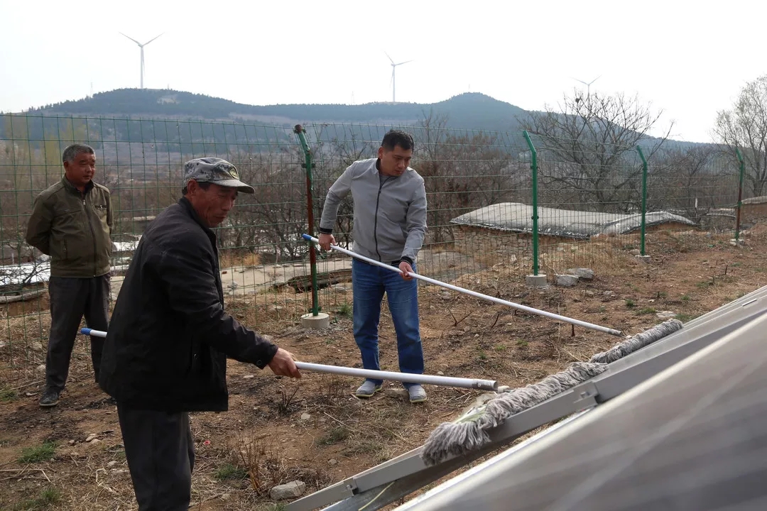 13:30沿著陡峭山路晚上走,王棟棟來到了村里的光伏發(fā)電項(xiàng)目,“有兩塊光伏板壞掉了,要及時(shí)向扶貧辦報(bào)修調(diào)換,不然會(huì)影響發(fā)電量”。王棟棟叮囑管理人員。報(bào)修完之后,王棟棟和維護(hù)人員一起對光伏板進(jìn)行擦洗維護(hù)。