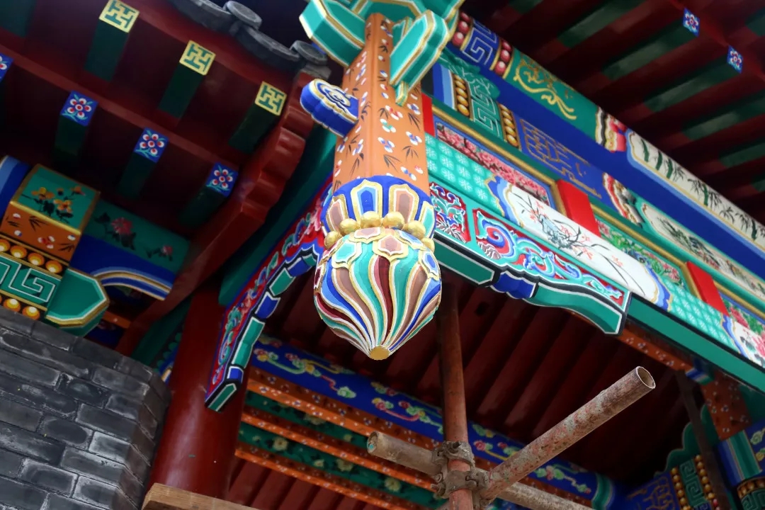 項目中仿古建筑的涂刷油漆部分做地仗都是采用“豬血+桐油”的古法油漆(“地仗”是一種采用“一麻五灰”的古老傳統(tǒng)工藝的施工做法)。仿古地仗油漆成活一般需要基層處理、下竹釘、捉縫灰、通灰、裹布等12道工序。清代彩繪的種類非常豐富,從紋飾的主體框架構(gòu)圖和題材方面分類可分五大類:和璽類、旋子類、蘇式類、海墁類和吉祥草類。“親王府”區(qū)域的建筑彩繪主要采用了三種繪畫形式,王府中軸線上建筑部分采用旋子墨線小點金彩繪,體現(xiàn)為輪廓線均用墨線,花心點金的形式;配房部分采用雅伍墨旋子彩繪,指完全不用金,線條用墨,旋子用藍(lán)、綠、白、黑四色,花瓣不起暈;長廊與園林部分的小型建筑部分采用蘇式彩繪,蘇式彩繪畫面內(nèi)容豐富,自然山水、花鳥魚蟲、各式人物一應(yīng)俱全。彩繪待地仗完成后還需依次為:丈量起譜子、刷生油、磨平、過水布、分中、打普子、瀝大小粉等13道工序。