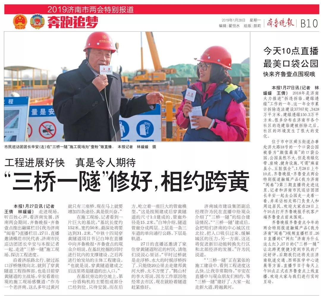走進(jìn)現(xiàn)場,聽百姓心聲,看濟(jì)南發(fā)展,濟(jì)南兩會期間,齊魯晚報(bào)·齊魯壹點(diǎn)推出融媒欄目《我為濟(jì)南“閱卷”》直播欄目。1月27日,模范市民代表、濟(jì)南市民巡訪團(tuán)團(tuán)長辛安與齊魯晚報(bào)記者一起,走進(jìn)濟(jì)南黃河隧道施工現(xiàn)場,探訪“三橋一隧”工程進(jìn)度。