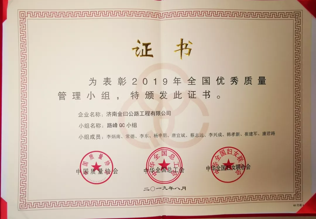 12月19日,2019年全國交通質(zhì)量年會(huì)在重慶召開,大會(huì)由中國交通企業(yè)管理協(xié)會(huì)主辦,以“共創(chuàng)交通質(zhì)量 建設(shè)建通強(qiáng)國”為主題,來自全國各地交通行業(yè)的代表參加了會(huì)議。濟(jì)南金曰公路工程有限公司路峰QC小組從全國交通系統(tǒng)600多個(gè)QC小組中脫穎而出,被評(píng)為全國優(yōu)秀質(zhì)量管理小組,成為全國交通行業(yè)五個(gè)全國優(yōu)秀管理小組中的一個(gè)。