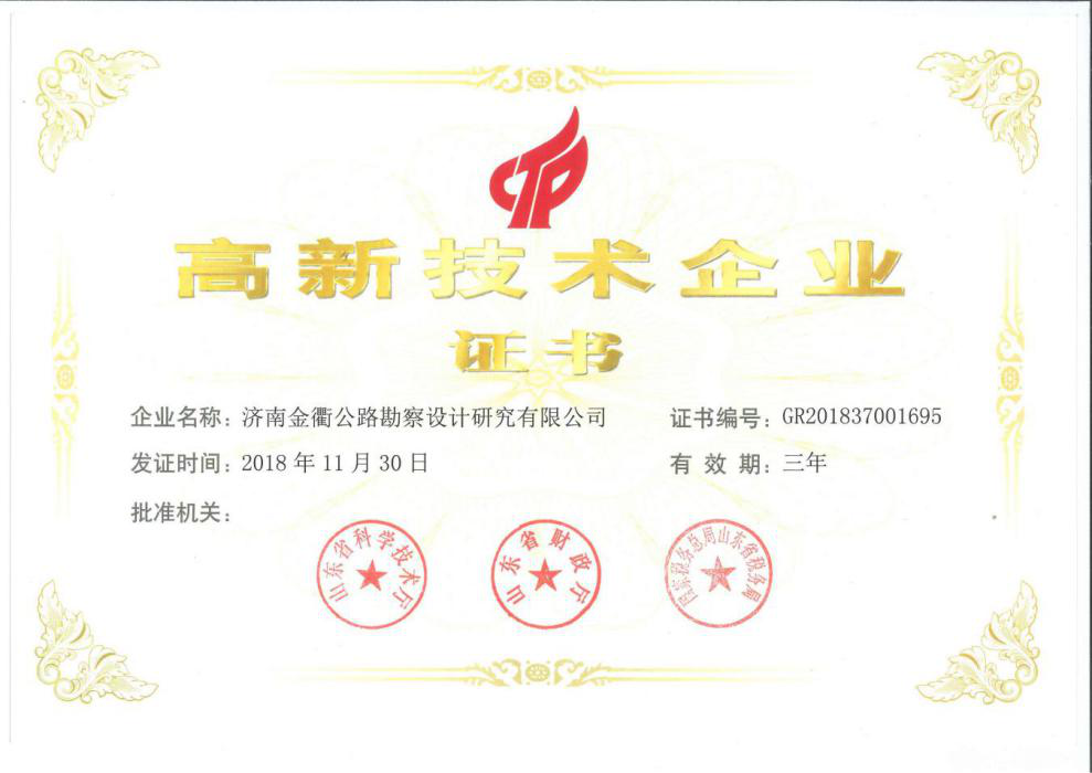 2019年3月14日,金衢公司喜獲由山東省科學(xué)技術(shù)廳、山東省財(cái)政廳、山東省國家稅務(wù)局和山東省地方稅務(wù)局聯(lián)合頒發(fā)的高新技術(shù)企業(yè)證書,這標(biāo)志著金衢公司正式邁入國家級高新技術(shù)企業(yè)行列。