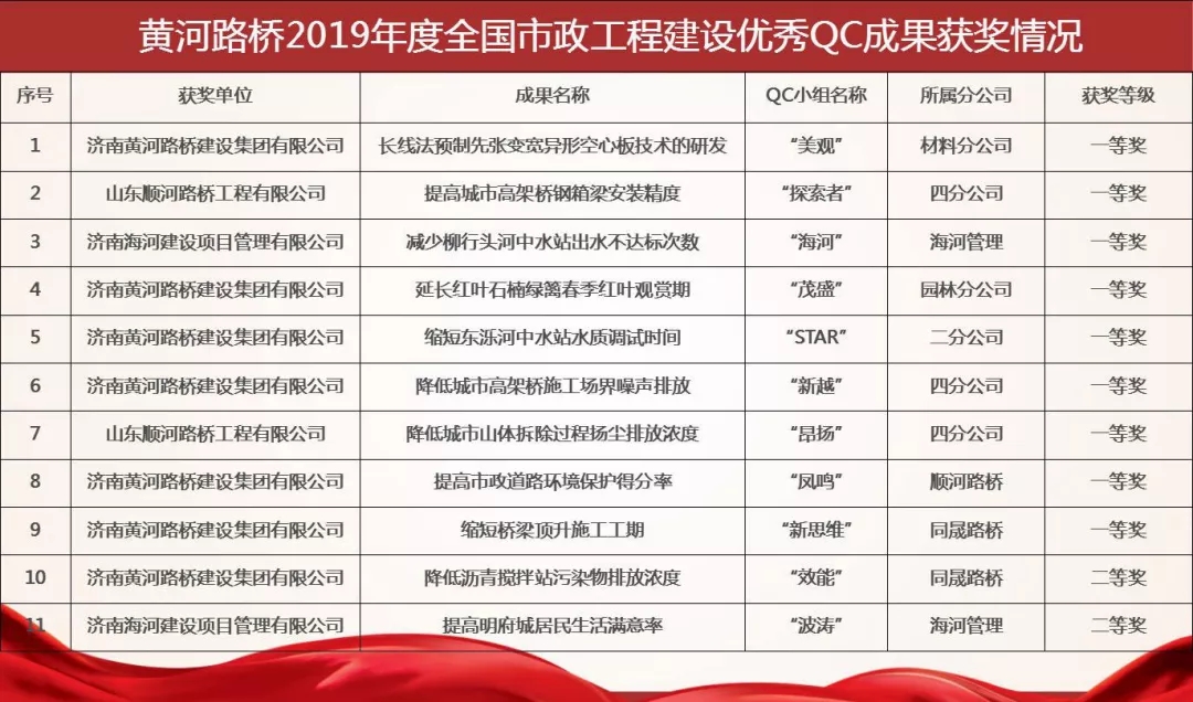 濟(jì)南黃河路橋建設(shè)集團(tuán)有限公司共有11項(xiàng)成果參與發(fā)布,其中9項(xiàng)成果榮獲一等獎(jiǎng),2項(xiàng)成果榮獲二等獎(jiǎng);同時(shí)黃河路橋建設(shè)集團(tuán)被評(píng)為2019年“全國市政工程建設(shè)QC小組活動(dòng)優(yōu)秀企業(yè)”,這是自2013年以來連續(xù)七年獲得此項(xiàng)殊榮。