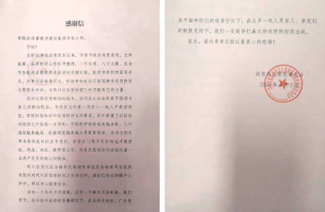 近日,一封來(lái)自槐蔭區(qū)段店社區(qū)居民委員會(huì)的感謝信發(fā)至濟(jì)南城市建設(shè)集團(tuán),感謝信的“主角”是集團(tuán)所屬華誼兄弟(濟(jì)南)電影城投資開(kāi)發(fā)有限公司的孫袖清同志。新型冠狀病毒肺炎疫情發(fā)生以來(lái),孫袖清放棄春節(jié)假期和周末休息時(shí)間,個(gè)人主動(dòng)聯(lián)系報(bào)名,積極參與社區(qū)疫情防控志愿服務(wù)工作,以實(shí)際行動(dòng)彰顯黨員和建設(shè)集團(tuán)人責(zé)任擔(dān)當(dāng),用無(wú)私奉獻(xiàn)展現(xiàn)一名“80后”的青春力量,與社區(qū)工作人員共同筑牢社區(qū)疫情防控安全線。