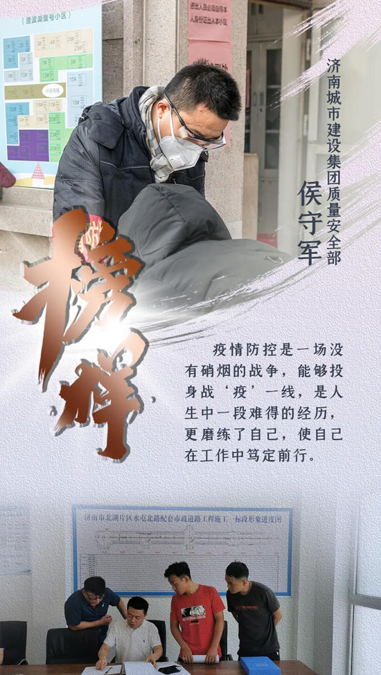 新型冠狀病毒肺炎疫情發(fā)生以來(lái),濟(jì)南城市建設(shè)集團(tuán)認(rèn)真貫徹落實(shí)中央、省、市關(guān)于疫情防控和復(fù)工復(fù)產(chǎn)的決策部署,上下一心、眾志成城,全體干部職工恪盡職守、扎根一線(xiàn),全員全力投入到疫情防控阻擊戰(zhàn)中。期間,涌現(xiàn)出了眾多先進(jìn)典型和感人故事,用實(shí)際行動(dòng)詮釋了建設(shè)集團(tuán)人的精神風(fēng)貌和責(zé)任擔(dān)當(dāng)。我們?cè)诩瘓F(tuán)宣傳平臺(tái)《榜樣》欄目,推出系列人物報(bào)道,挖掘宣傳一線(xiàn)典型,提振士氣、凝聚力量,激勵(lì)我們繼續(xù)前行,堅(jiān)決打贏(yíng)疫情防控的人民戰(zhàn)爭(zhēng)、總體戰(zhàn)、阻擊戰(zhàn)。