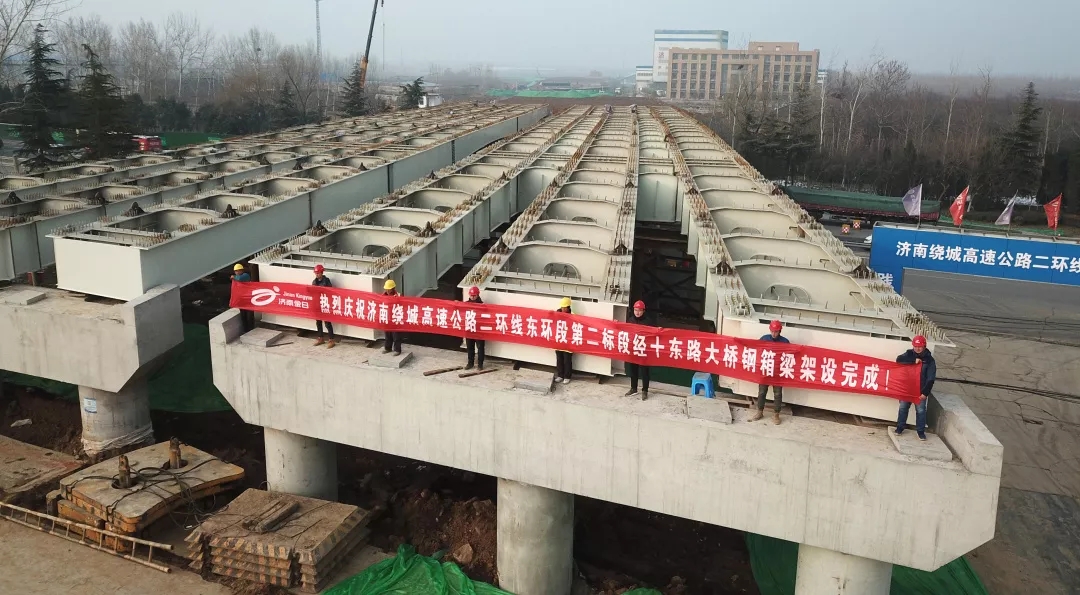 1月18日,濟(jì)南繞城高速公路二環(huán)線東環(huán)段二標(biāo)段(濟(jì)南“大東環(huán)”)互通主線橋跨經(jīng)十路鋼箱梁順利合攏。至此,項目跨越經(jīng)十東路大橋鋼箱梁架設(shè)工作全部完成,為實現(xiàn)年底通車的目標(biāo)打下了良好基礎(chǔ)。