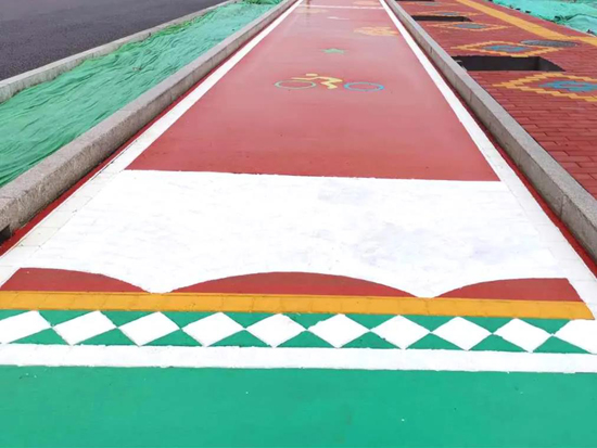 此次創(chuàng)新將SP彩色壓花、熒光瀝青路面工藝在慢車道上進行試驗,施工時選用紅、綠、藍三種基礎顏色分段進行。通過噴涂SP專用涂料,改變?yōu)r青面層顏色,不但提高了道路辨識度,同時能夠在無分隔帶道路中明確機非車道界限,有利于規(guī)范非機動車規(guī)范行車,降低事故發(fā)生概率。