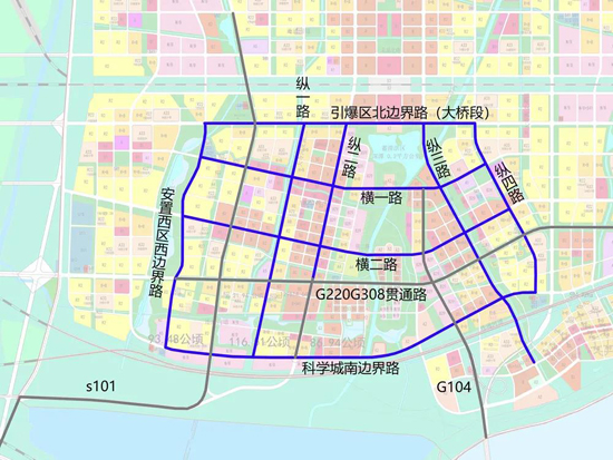 大橋組團(tuán):引爆區(qū)北邊界路(大橋段)、橫一路、橫二路、G220G308貫通路、科學(xué)城南邊界路、安置西區(qū)西邊界路、S101、縱一路、縱二路、G104、縱三路、縱四路;