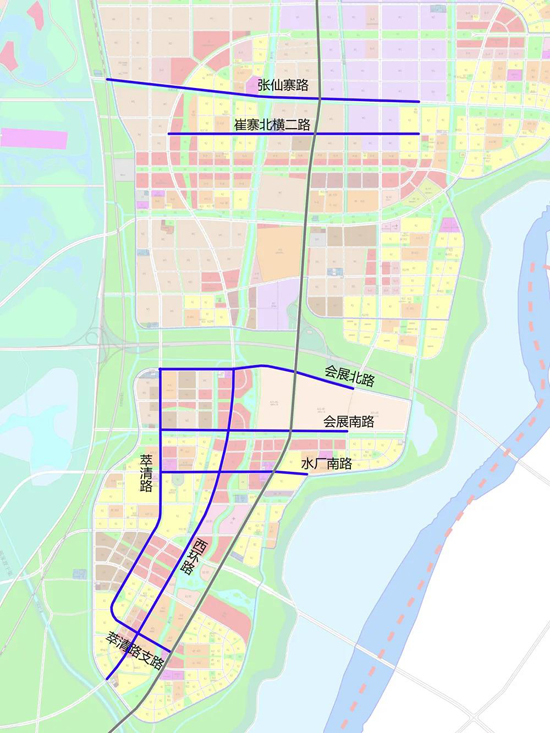 崔寨組團(tuán):萃清路支路、水廠南路、會(huì)展南路、會(huì)展北路、崔寨北橫二路、張仙寨路、萃清路、西環(huán)路。
