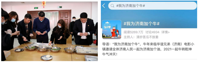 2021春節(jié)期間,華誼兄弟(濟南)電影城投資開發(fā)有限公司開展了年終總結(jié)表彰會、包餃子迎新年、我為濟南加個牛等一系列新春活動,喜迎牛年新春佳節(jié)的到來,營造了喜慶祥和的節(jié)日氛圍。