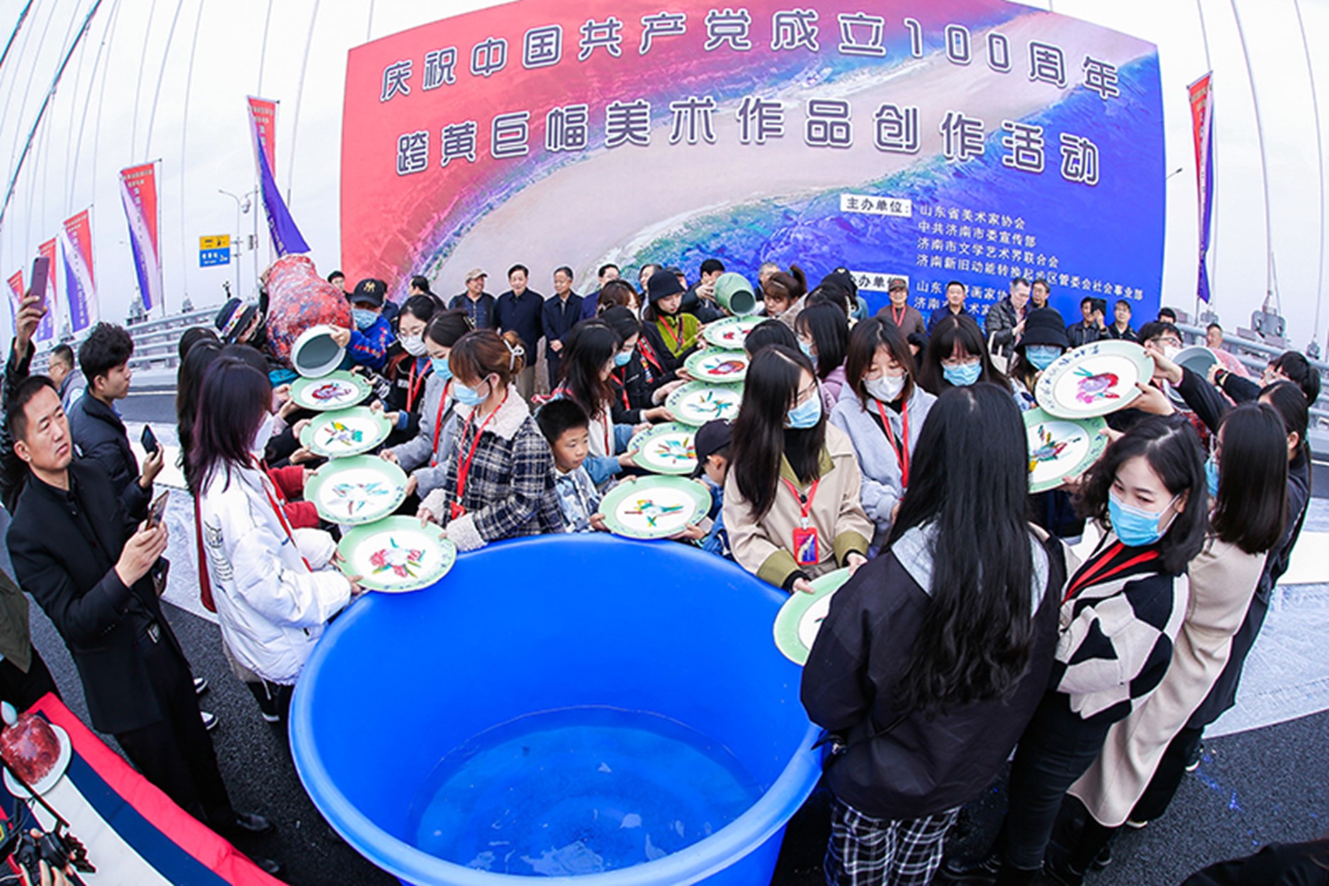 為助力黃河重大國家戰(zhàn)略實施,在新時代現(xiàn)代化強省會建設(shè)和服務(wù)全市改革發(fā)展大局中彰顯文化擔(dān)當,11月6日,山東省美術(shù)家協(xié)會、中共濟南市委宣傳部、濟南市文學(xué)藝術(shù)界聯(lián)合會、濟南新舊動能轉(zhuǎn)換起步區(qū)管委會社會事業(yè)部在濟南鳳凰黃河大橋聯(lián)合組織舉辦慶祝中國共產(chǎn)黨成立100周年跨黃巨幅美術(shù)作品創(chuàng)作活動?;顒又荚谶M一步保護、傳承和弘揚黃河文化,深入挖掘黃河文化的時代價值,以優(yōu)秀的藝術(shù)作品記錄新時代、謳歌新時代,為“文化濟南”建設(shè)貢獻文藝力量。