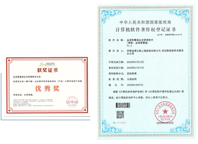 2020年,金諾公司與西安凱悅軟件有限責(zé)任公司合作,研發(fā)了“金諾智慧通”企業(yè)管理軟件,于2020年12月取得中國(guó)版權(quán)保護(hù)中心頒發(fā)的軟件著作權(quán)登記證書。“金諾智慧通”參加了第一屆中國(guó)(山東)數(shù)字經(jīng)濟(jì)優(yōu)秀項(xiàng)目(產(chǎn)品)大賽,并獲得產(chǎn)品組“優(yōu)秀獎(jiǎng)”。同時(shí),2020年下半年推動(dòng)的針對(duì)公路工程建設(shè)開發(fā)的“路面三維剖面破損(病害)自動(dòng)檢測(cè)系統(tǒng)”、“橋梁在線監(jiān)測(cè)系統(tǒng)”等8個(gè)軟件已申報(bào)軟件著作權(quán)登記,軟件著作權(quán)登記證書已于2021年3月份下發(fā)。