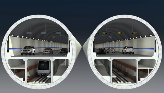 項目提出了雙道防淹門解決方案,以實現(xiàn)全方位有效封堵,保護城市安全。為拓展城市空間,濟南黃河隧道設(shè)計為城市市政道路和軌道交通合建方案,實現(xiàn)隧道空間最大利用率。“萬里黃河第一隧”設(shè)計為雙管雙層公軌合建盾構(gòu)隧道,上層為公路雙向6車道,下層為軌道交通以及排煙通道、管廊和逃生通道,實現(xiàn)一次穿越黃河的利用率最大化,極大降低了對環(huán)境的影響。