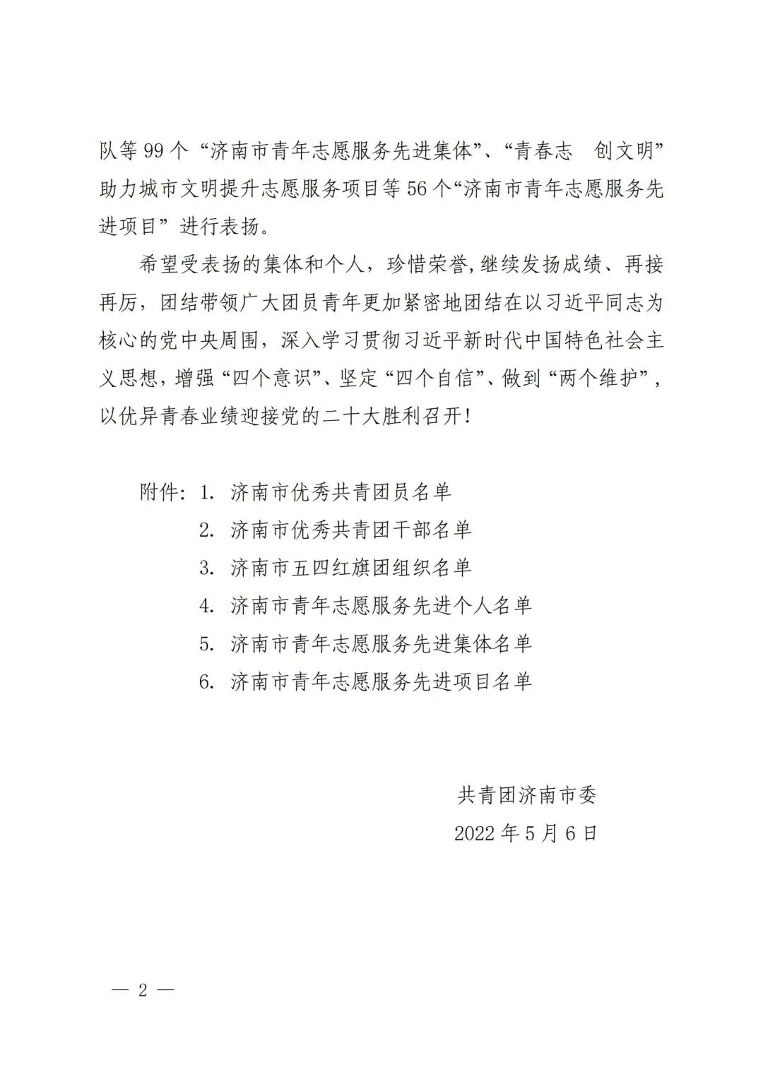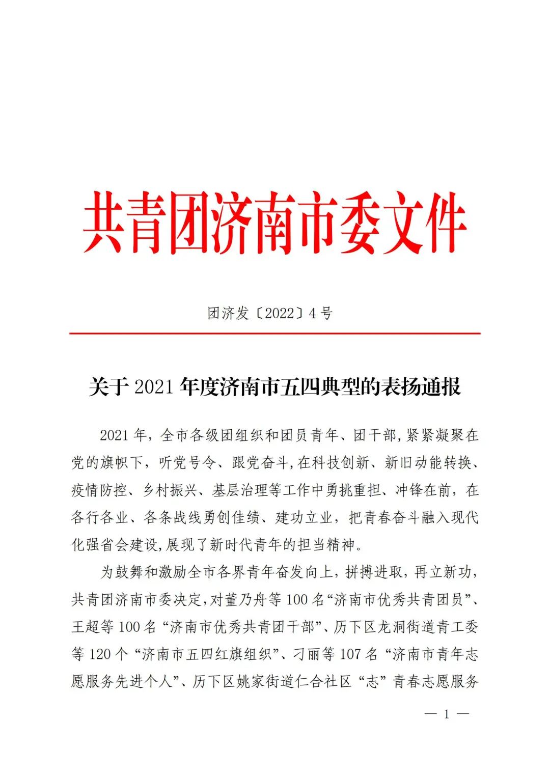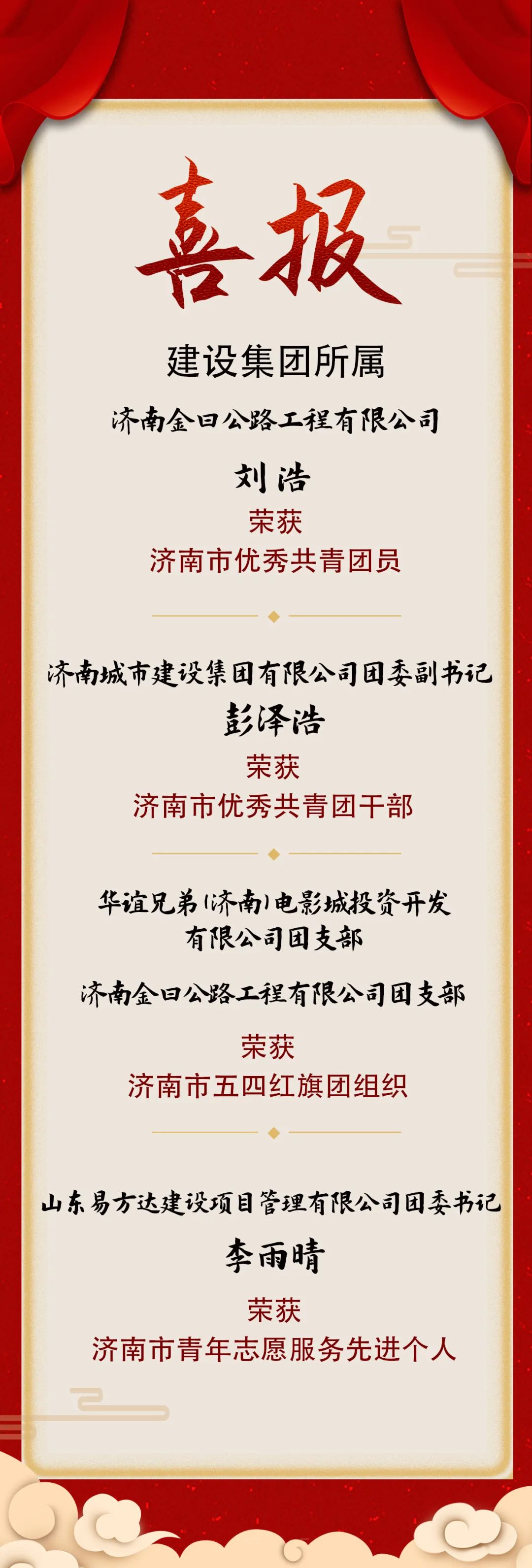 近日,共青團濟南市委公布了《關(guān)于2021年度濟南市五四出彩典型的表揚通報》,建設(shè)集團團委所屬團組織及團員青年榮獲“濟南市五四紅旗團組織”“濟南市青年志愿服務(wù)先進個人”“濟南市優(yōu)秀共青團員”“濟南市優(yōu)秀共青團干部”等4項榮譽稱號。