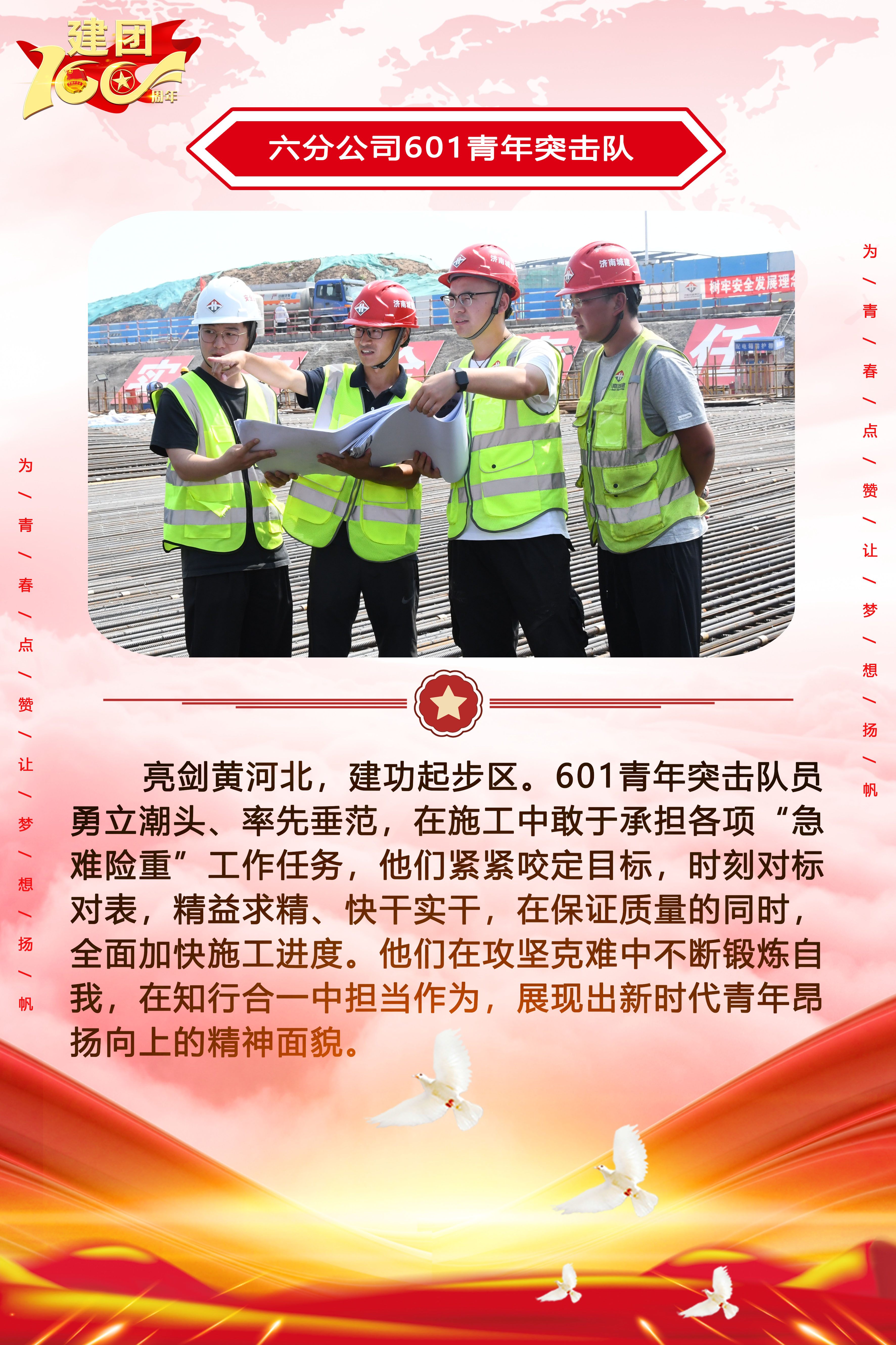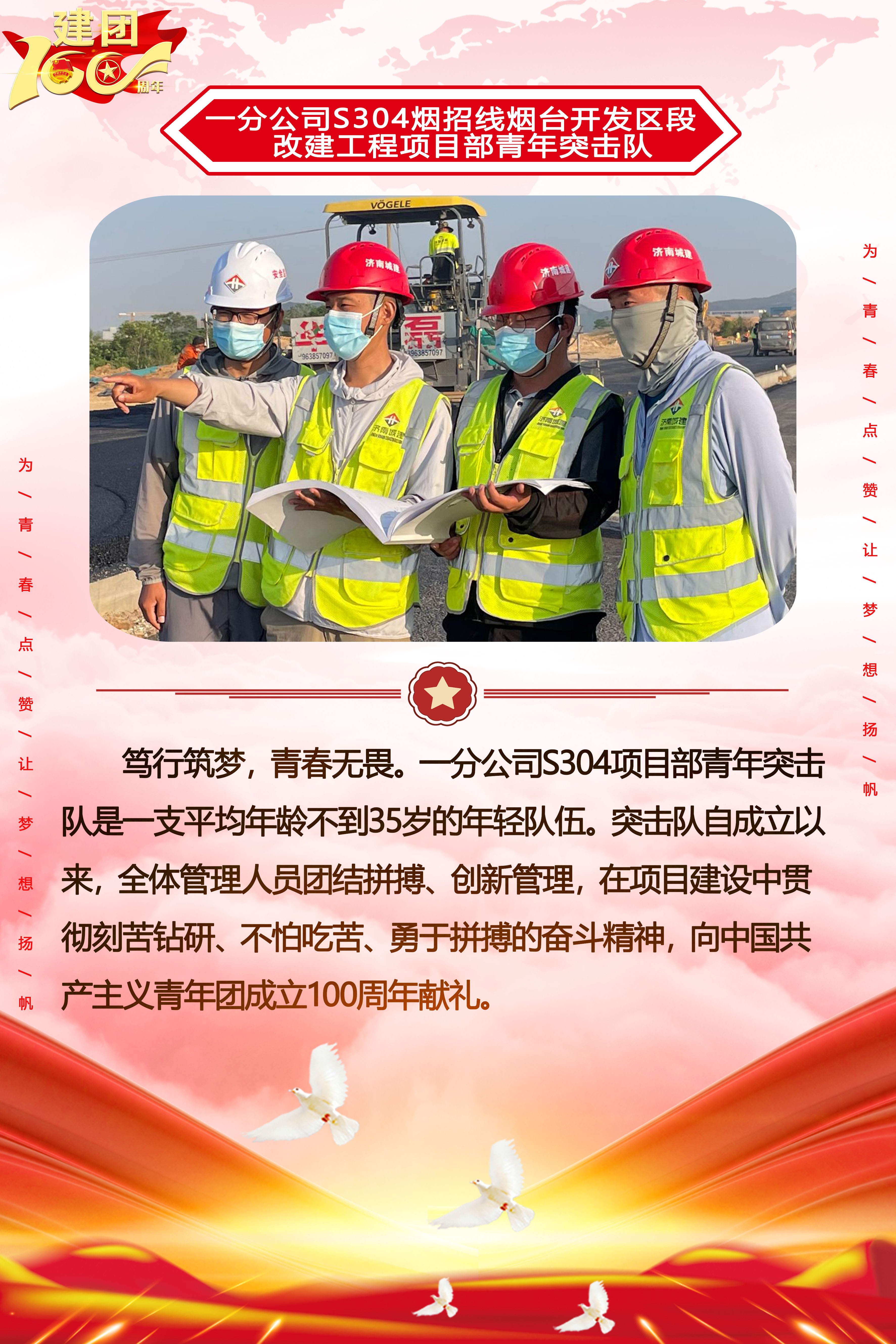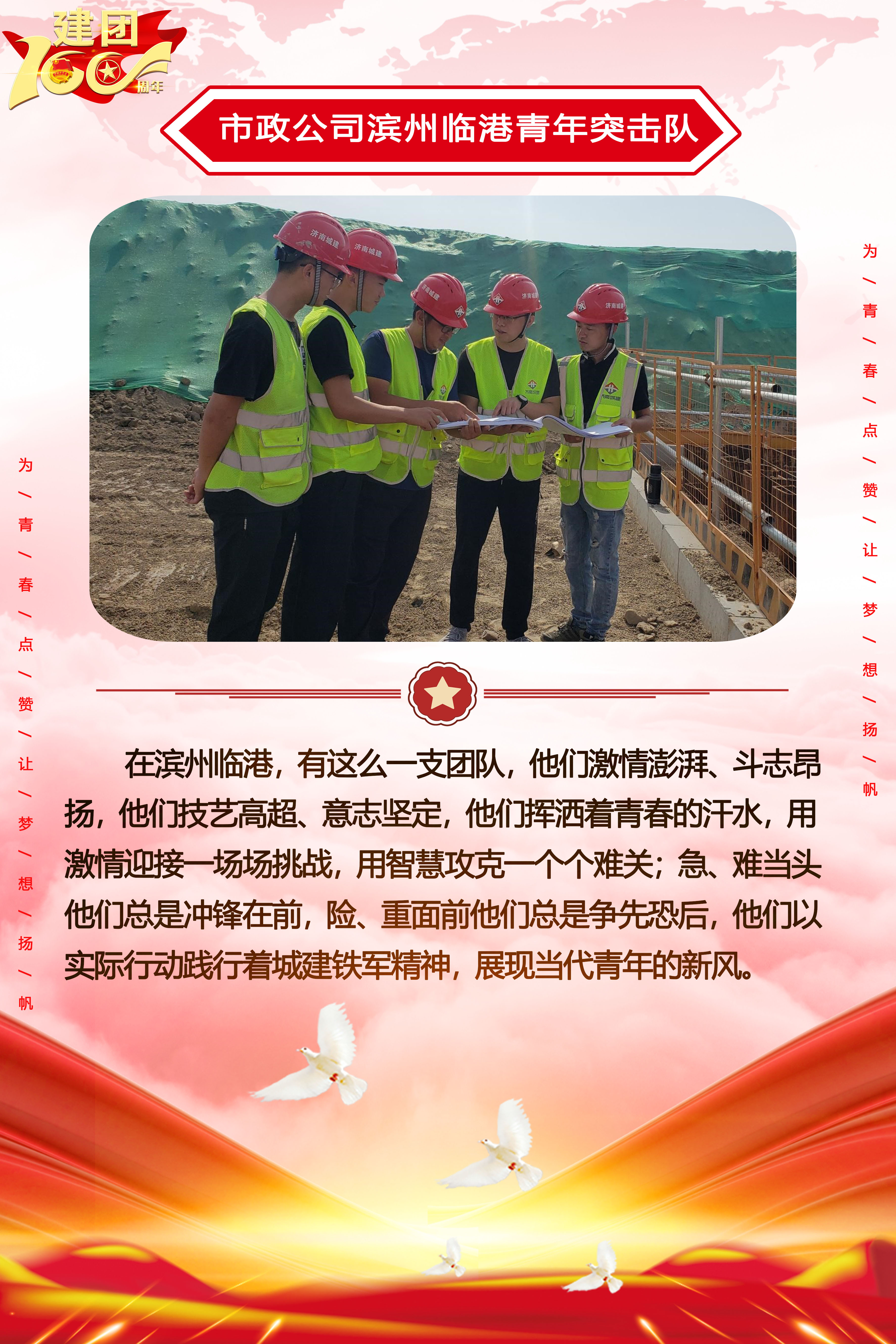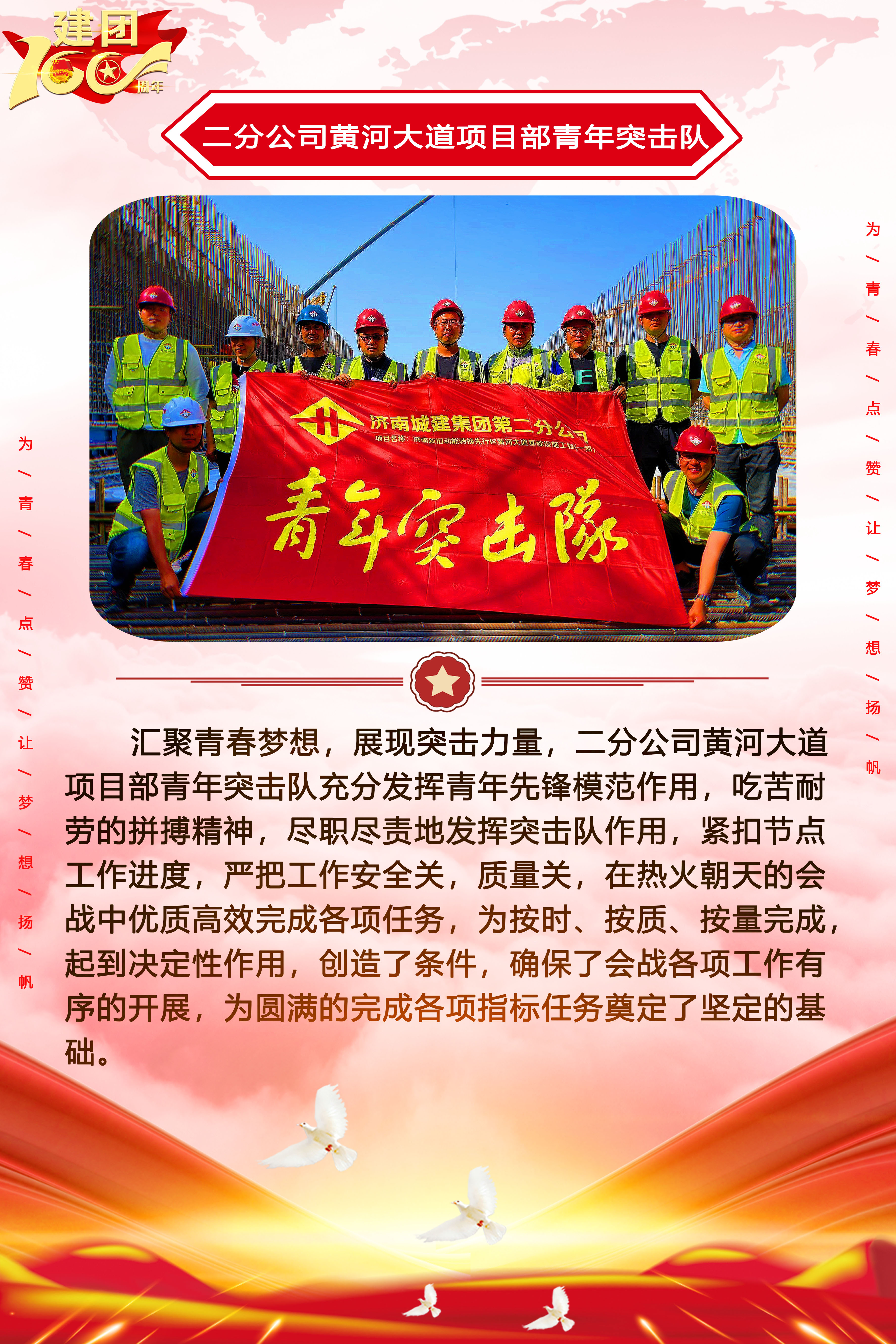 為慶祝中國共產(chǎn)主義青年團(tuán)成立100周年,深情回顧共青團(tuán)發(fā)展歷程,進(jìn)一步增強廣大團(tuán)員青年敬團(tuán)、愛團(tuán)意識,提升團(tuán)組織的凝聚力和向心力,展示公司團(tuán)員青年積極向上、奮發(fā)有為的精神風(fēng)貌,集團(tuán)第四團(tuán)委——濟(jì)南城建集團(tuán)有限公司團(tuán)委持續(xù)開展團(tuán)旗在城建飄揚合影活動。
