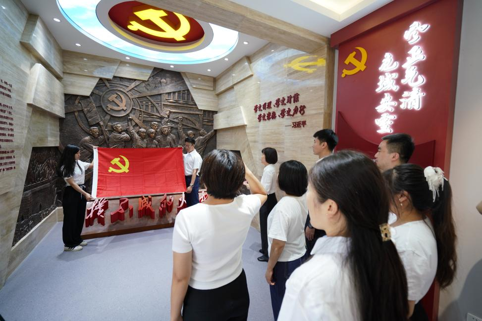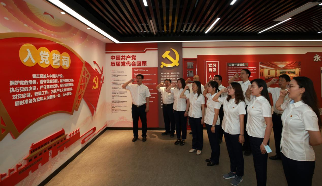 山東金宇信息科技集團(tuán)黨支部與濟(jì)南市道路和橋隧服務(wù)中心黨委開展共建,組織黨員赴山東省黨史教育基地之一--濟(jì)南市萊蕪區(qū)雪野街道房干精神展館,共同開展“迎‘七一’,重溫入黨誓詞”主題黨日活動(dòng)?;顒?dòng)現(xiàn)場,全體黨員面對(duì)黨旗莊嚴(yán)宣誓,重溫入黨誓詞,再憶入黨初心,堅(jiān)定理想信念,強(qiáng)化黨性修養(yǎng)。