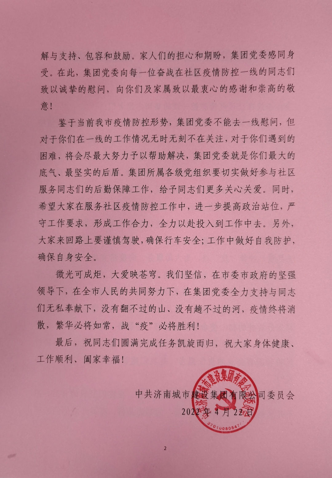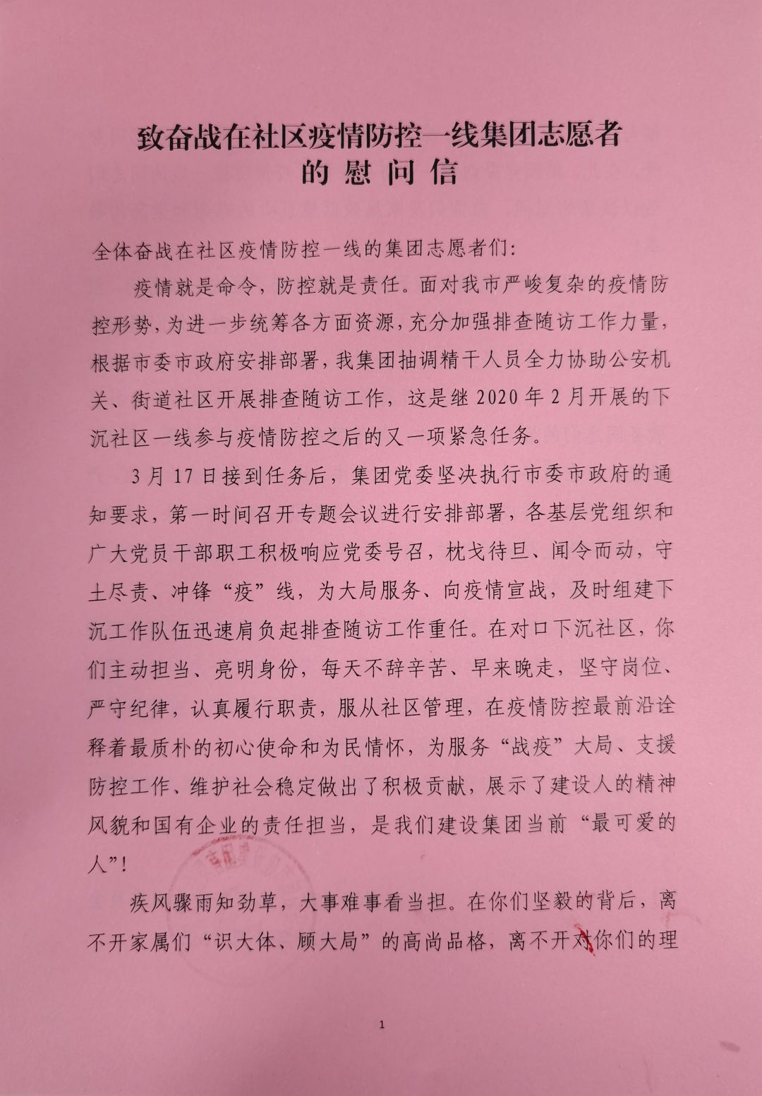 鑒于當(dāng)前我市疫情防控形勢(shì),集團(tuán)黨委不能去一線慰問(wèn),但對(duì)于你們?cè)谝痪€的工作情況無(wú)時(shí)無(wú)刻不在關(guān)注,對(duì)于你們遇到的困難,將會(huì)盡最大努力予以幫助解決,集團(tuán)黨委就是你們最大的底氣、最堅(jiān)實(shí)的后盾。集團(tuán)所屬各級(jí)黨組織要切實(shí)做好參與社區(qū)服務(wù)同志們的后勤保障工作,給予同志們更多關(guān)心關(guān)愛(ài)。同時(shí),希望大家在服務(wù)社區(qū)疫情防控工作中,進(jìn)一步提高政治站位,嚴(yán)守工作要求,形成工作合力,全力以赴投入到工作中去。另外,大家來(lái)回路上要謹(jǐn)慎駕駛,確保行車安全;工作中做好自我防護(hù),確保自身安全。