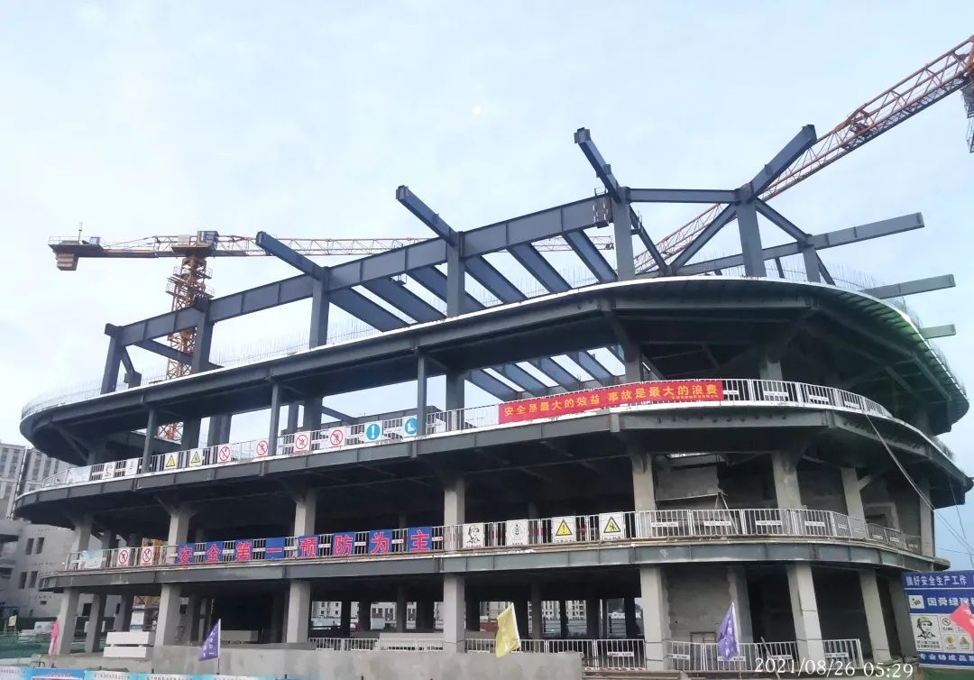 在主體結(jié)構(gòu)施工中,采用鋼構(gòu)框架安裝,施工采用BIM排布鋼構(gòu)安裝順序,鋼構(gòu)組件抵達施工現(xiàn)場后施工人員按照編號快速有效拼接。樓板采用樓承板安裝,在免除支模板施工同時也提高了安全性加快了施工進度,實現(xiàn)了安全經(jīng)濟環(huán)保的綜合效益。