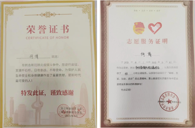 在疫情防控期間,何倩主動(dòng)請(qǐng)纓,逆行出征,協(xié)助桿石橋街道完成核酸檢測(cè)、物資搬運(yùn)等疫情防控工作,得到了社區(qū)的高度認(rèn)可。
