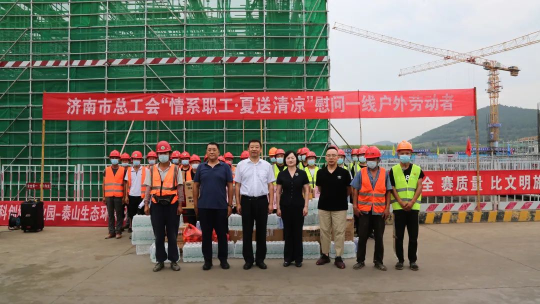 8月12日上午,濟南市總工會副主席申世平帶隊到中科院濟南科創(chuàng)城產業(yè)園項目現(xiàn)場,為一線職工送去防暑降溫物品,慰問一線建設者,市總工會宣教部二級調研員張昭力,建設集團黨委副書記鐘善良,集團工會相關負責同志參加活動。