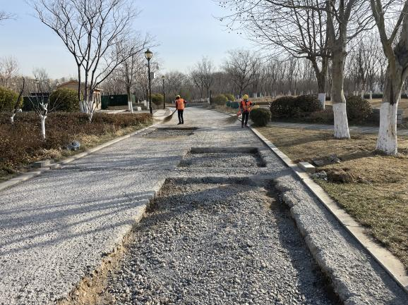針對(duì)市民反映的補(bǔ)修華山湖北岸部分道路的訴求,集團(tuán)高度重視,工程二部相關(guān)工作人員立即到現(xiàn)場實(shí)地勘察,組織編制整修方案,確定將上部松散面層銑刨后,更換為瀝青面層,并于2月28日進(jìn)場實(shí)施??茖W(xué)組織,加強(qiáng)調(diào)度,在保護(hù)公園環(huán)境及周邊既有設(shè)施不遭破壞的基礎(chǔ)上,于3月25日施工完成,比預(yù)計(jì)時(shí)間提前一周。