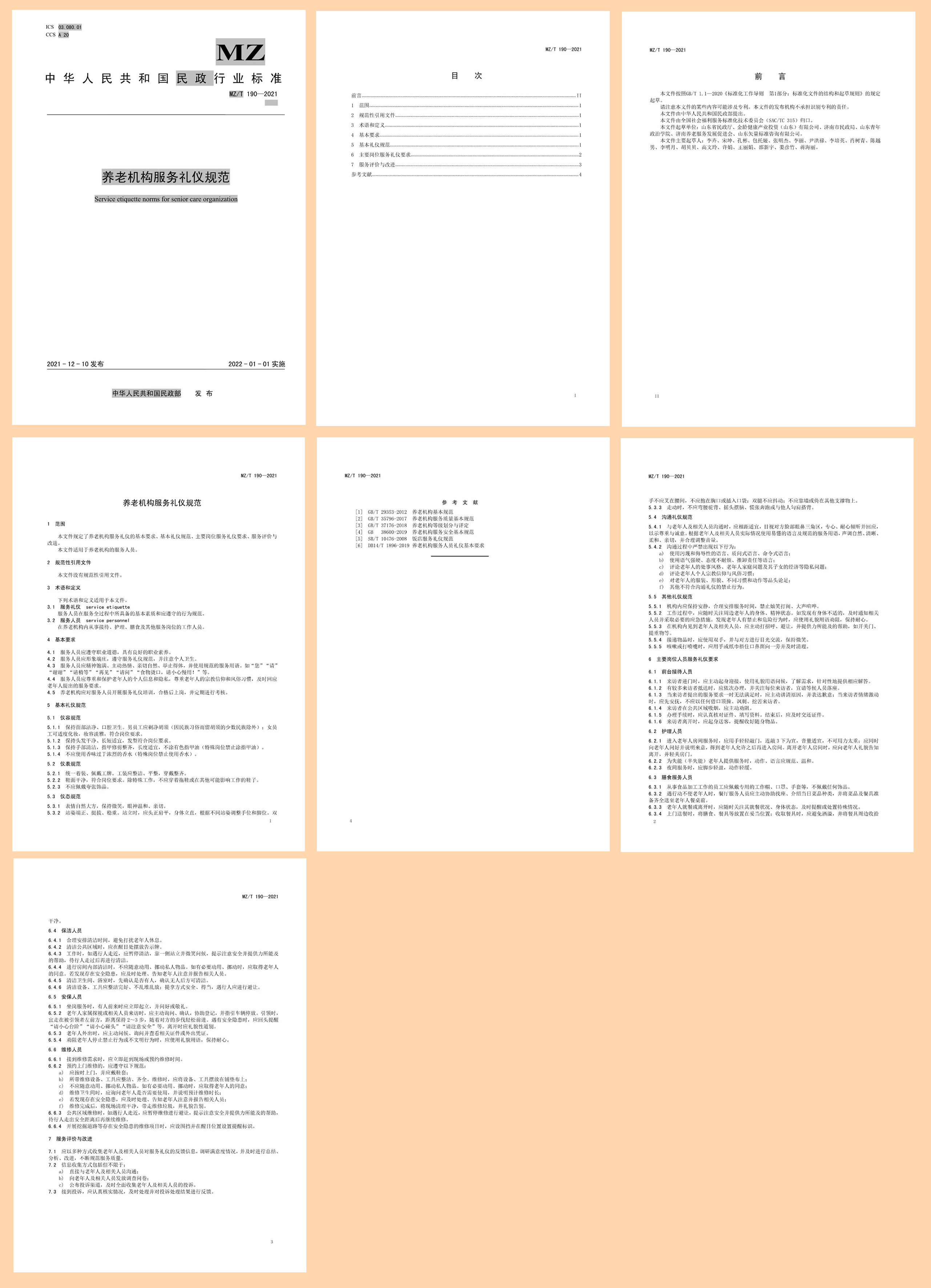 《養(yǎng)老機(jī)構(gòu)服務(wù)禮儀規(guī)范》規(guī)定了養(yǎng)老機(jī)構(gòu)服務(wù)禮儀的基本要求、基本禮儀規(guī)范、主要崗位服務(wù)禮儀要求、服務(wù)評價與改進(jìn),適用于所有養(yǎng)老機(jī)構(gòu)的服務(wù)人員。
