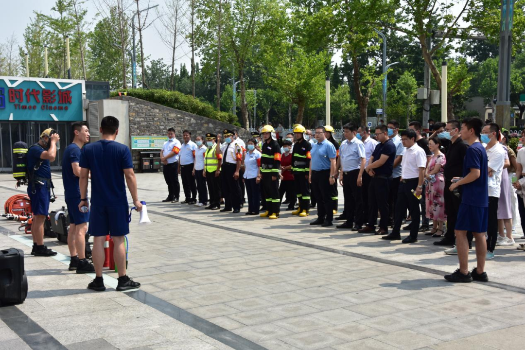 消防演練模擬城發(fā)廣場(chǎng)出現(xiàn)火情,現(xiàn)場(chǎng)迅速啟動(dòng)應(yīng)急預(yù)案,指揮部組織調(diào)度應(yīng)急搶險(xiǎn)組、安全保衛(wèi)組、人員疏散組、醫(yī)療救護(hù)組分頭行動(dòng),完成現(xiàn)場(chǎng)滅火、人員撤離、物資轉(zhuǎn)移、傷員救治等工作。