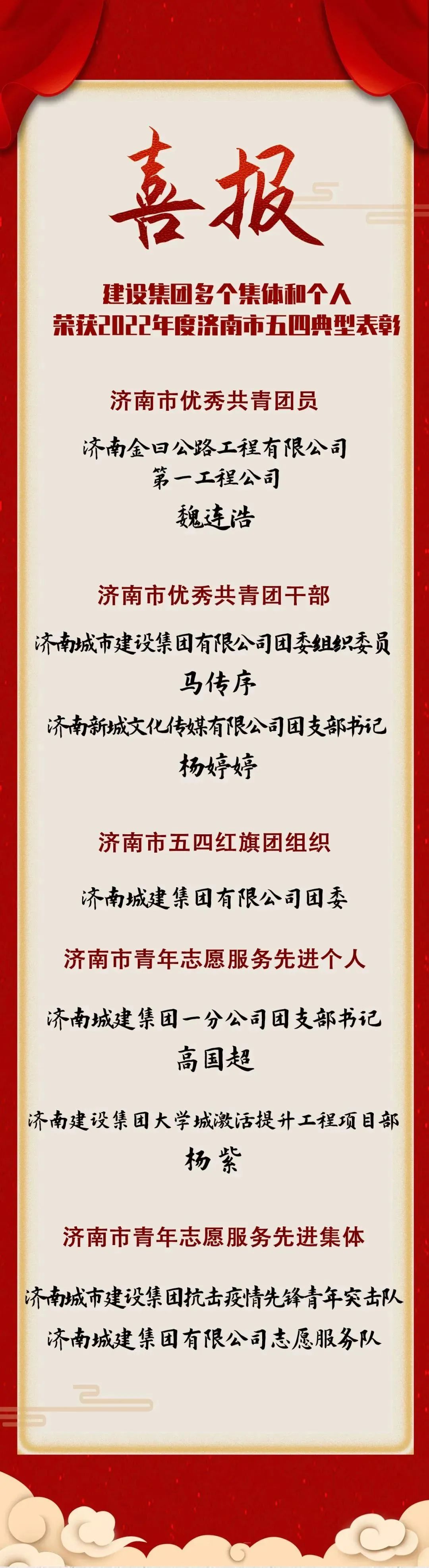 5月5日,共青團濟南市委公布了《2022年度濟南市五四典型表揚通報》,建設(shè)集團團委所屬團組織及團員青年榮獲“濟南市優(yōu)秀共青團員”“濟南市優(yōu)秀共青團干部”“濟南市五四紅旗團組織”“濟南市青年志愿服務先進個人”“濟南市青年志愿服務先進集體”等5項榮譽稱號。