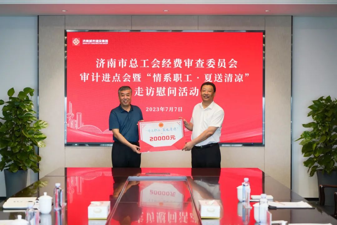 7月7日,市總工會(huì)黨組成員、經(jīng)費(fèi)審查委員會(huì)主任劉明忠?guī)ш?duì)到建設(shè)集團(tuán)開(kāi)展?jié)鲜锌偣?huì)經(jīng)費(fèi)審查委員會(huì)審計(jì)進(jìn)點(diǎn)會(huì)暨“情系職工·夏送清涼”走訪慰問(wèn)活動(dòng),市總工會(huì)經(jīng)審辦主任宋強(qiáng),建設(shè)集團(tuán)黨委副書(shū)記鐘善良出席活動(dòng)。
