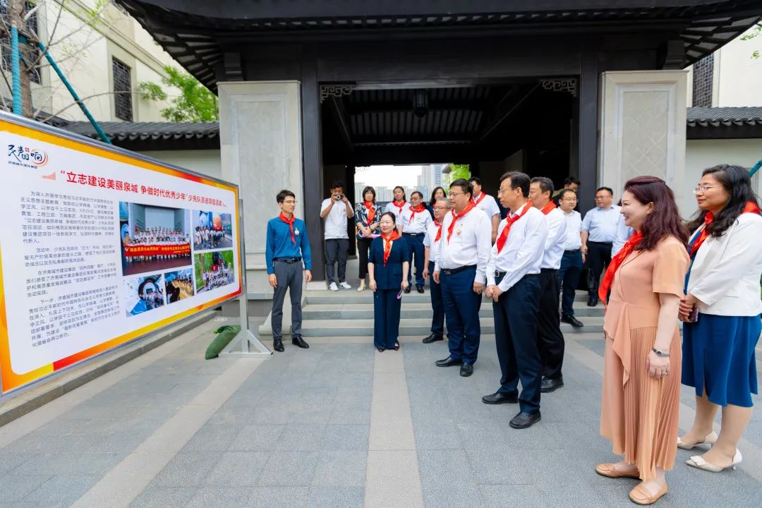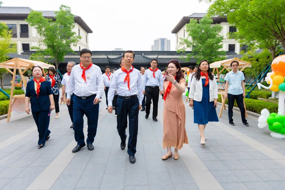活動結束后,孫常建一行在楊柳春風學校進行了實地參觀調研,了解了書香校園建設活動,并與孩子們進行了親切交流。孩子們熱情洋溢地介紹了“槐蔭少年說”黨團隊一體化品牌建設活動、“我是黃河岸邊好少年”黃河文化項目化學習特色課程、“我眼中的康養(yǎng)名城、活力槐蔭”畫展和手工展、“家住槐蔭‘育’見成長”教育品牌、學校校訓和南北融合辦學理念等情況,并進行了古箏、寫生、經典誦讀等美育教育特色活動表演,美術社團、舞蹈社團、合唱團、足球社團、啦啦隊的成員代表們進行了成果展示。