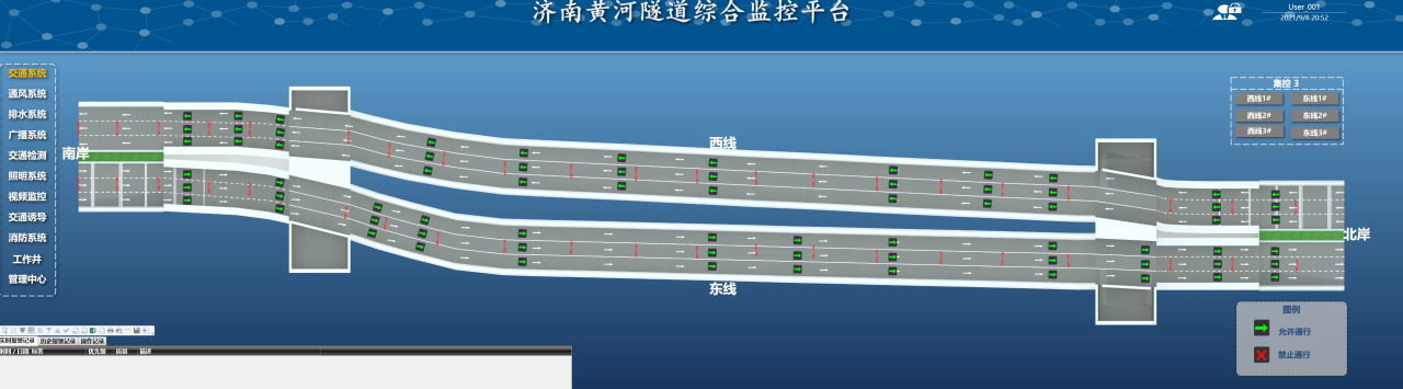在濟(jì)南黃河濟(jì)濼路隧道中,交通系統(tǒng)的主要設(shè)備包括72個(gè)道路指示燈、7塊情報(bào)板和12組車(chē)感線(xiàn)圈,設(shè)備的應(yīng)用可以有效地誘導(dǎo)車(chē)輛按照規(guī)定的路線(xiàn)和速度行駛,保證交通流暢和安全,進(jìn)一步提高交通運(yùn)營(yíng)效率;