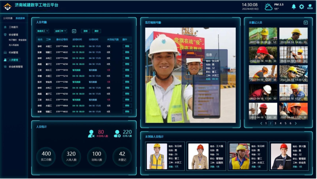 人員管理實(shí)現(xiàn)優(yōu)化,G104京嵐線(xiàn)濟(jì)南黃河公路大橋擴(kuò)建工程項(xiàng)目應(yīng)用智能化勞務(wù)人員管理系統(tǒng),系統(tǒng)根據(jù)視頻采樣,可以實(shí)時(shí)定位,統(tǒng)計(jì)當(dāng)日出勤人數(shù),能夠針對(duì)不系安全帶、不正確佩戴安全防護(hù)用品,違章動(dòng)火作業(yè)等進(jìn)行智能識(shí)別,并抓拍報(bào)警。系統(tǒng)累計(jì)保障工地安全620天,累計(jì)錄入工人800余人,攝像頭安裝17個(gè),避免了火災(zāi),機(jī)械違規(guī)載人,安全用品佩戴不規(guī)范,防護(hù)缺失等隱患發(fā)生。