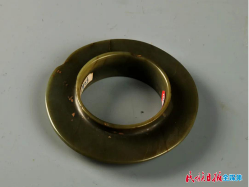 三聯(lián)璧是該館的重要藏品之一,這件器物屬于透閃石玉,整體呈扇面狀,由三件玉片連接而成,每一片都兩側(cè)對(duì)稱,兩端鉆孔,孔一面大一面小,呈喇叭狀,采用單面鉆孔法。此套三聯(lián)璧雖加工簡(jiǎn)單,但琢工端莊大氣、拙樸豪放,它在最初以配飾形式出現(xiàn),到了齊家文化時(shí)期作為祭祀用的禮器,成為權(quán)勢(shì)與地位的象征。