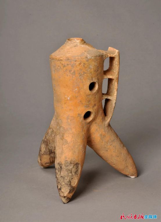 除了玉器,這里還展出了齊家文化最具代表性的器物——陶器。其中一件叫三足盉,是齊家陶器的代表性器物。這件展品問(wèn)世后,因結(jié)構(gòu)巧妙、制作精良、年代久遠(yuǎn)且保存非常完整,引起了國(guó)際上的關(guān)注,獲得世界各國(guó)專家學(xué)者的一致好評(píng)。