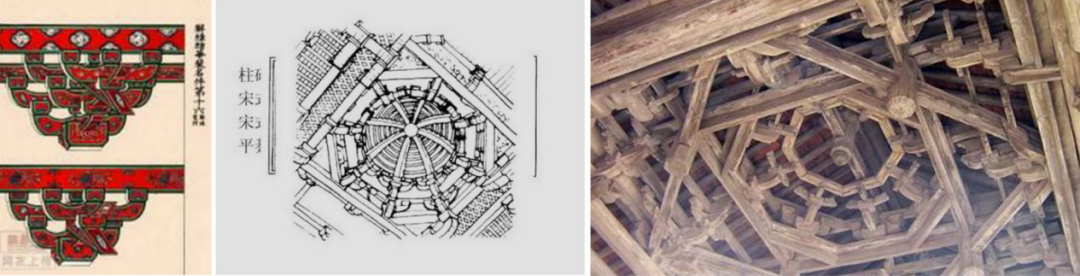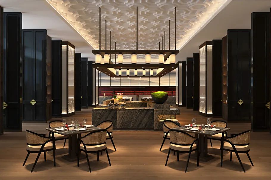 宴會廳天花的設(shè)計借鑒宋式屋架結(jié)構(gòu),通過現(xiàn)代設(shè)計手法進行簡化概括形成符合現(xiàn)代人審美的造型裝置藝術(shù)。