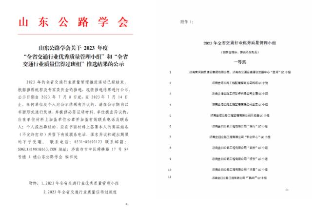 山東公路學(xué)會(huì)發(fā)布《山東公路學(xué)會(huì)關(guān)于2023年度“全省交通行業(yè)優(yōu)秀質(zhì)量管理小組”和“全省交通行業(yè)質(zhì)量信得過班組”推選結(jié)果的公示》。金曰公司“篤行”“科創(chuàng)中心”“路安”“橋安”“求真”“鵲鳴”6個(gè)QC小組成果榮獲一等獎(jiǎng),其他成果另獲二等獎(jiǎng)19項(xiàng)、三等獎(jiǎng)5項(xiàng);5個(gè)班組獲得“全省交通行業(yè)信得過班組”稱號(hào)。